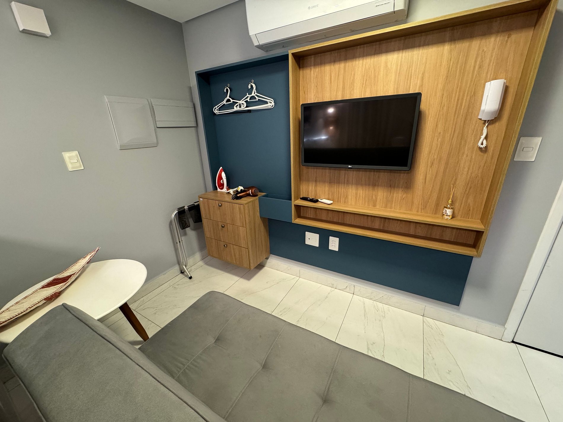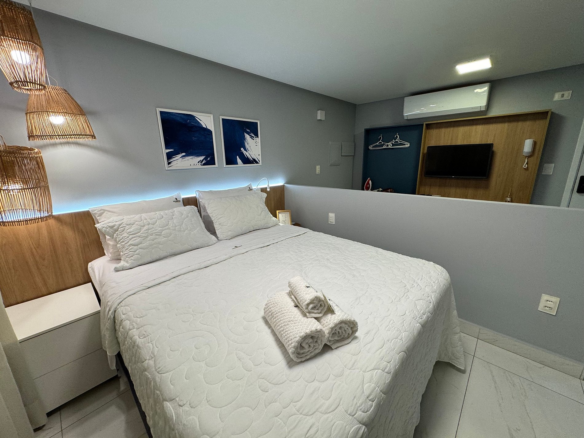 Cozinha completa, WC, área de TV e cama confortável.