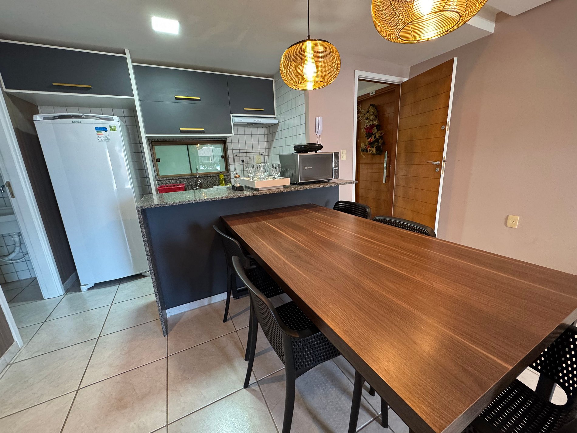 A cozinha está totalmente equipada com geladeira, micro-ondas e todos os utensílios necessários para o seu dia a dia. Relaxe na sala ampla com TV ou aproveite a varanda com vista para o mar.